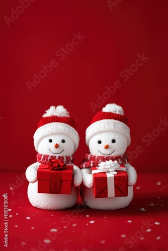 Two cute snowmen wearing knit hats and scarves, holding red Christmas gifts, standing on a red background with copy space