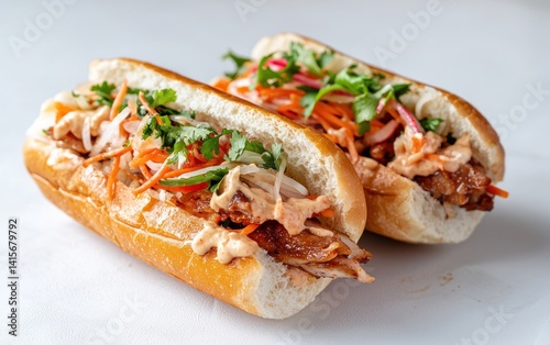 Two delicious banh mi sandwiches on a white background. The sandwiches are filled with meat, pickled vegetables, and herbs. The image is well-lit and the sandwiches are in focus