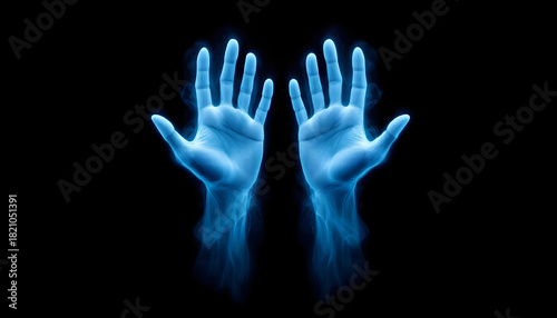 Two disembodied hands, rendered in a ghostly blue hue, float against a stark black background