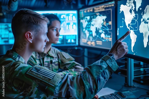 two diverse soldiers in uniform in military command center with pointing at a map on a computer screen
