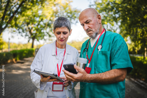 Two doctor review data on mobile phone and digital tablet
