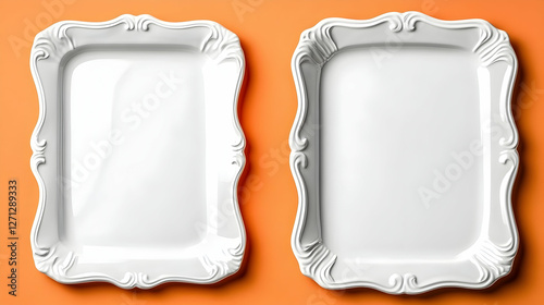 Two empty white ornate rectangular plates on orange. Food presentation mockup