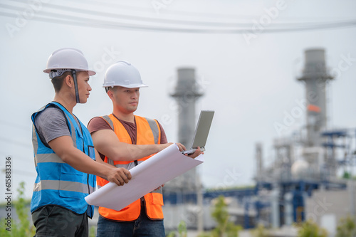 Two engineer working at power plant,Work together happily,Help each other analyze the problem,Consult about development guidelines