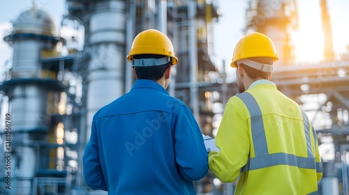 Two Engineers Wearing Safety Gear Discussing Refinery in Energy Industry