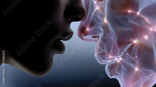Two faces are captured in close-up, gently merging into an abstract light form, representing the deep connection between individuals and the complexity of human emotions and identity.
