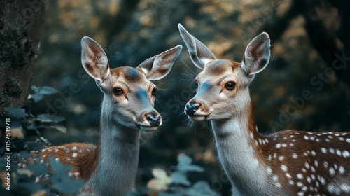 Two Fawn Deer in a Forest, Close-Up Portrait
