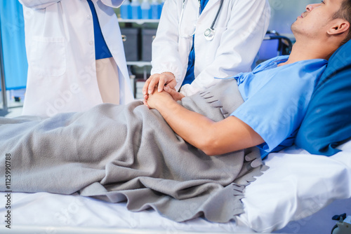Two female doctors examine a patient lying on a hospital bed,discuss the medical chart,administer medicine,and provide encouragement, ensuring compassionate care and fostering the patient's recovery