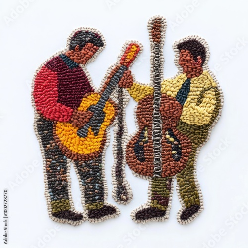 Two figures, one holding a guitar and the other a double bass, are depicted in a felt appliqu? style.
