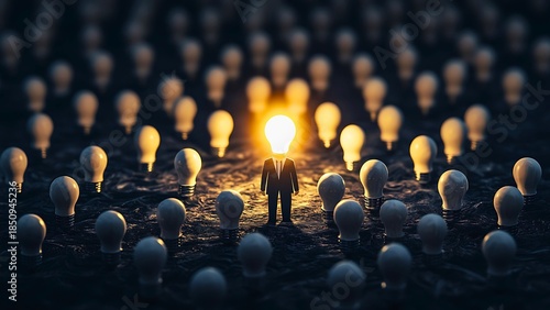 Two figures stand in front of a glowing lightbulb, surrounded by many other lightbulbs in a dim setting. The illuminated lightbulb above the heads of the figures symbolizes an outstanding idea