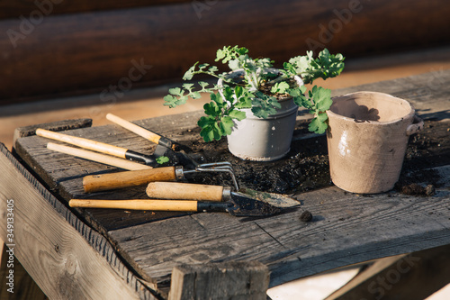 Two flower pots with the inscription. In one flower seedlings and nearby on the table are garden tools