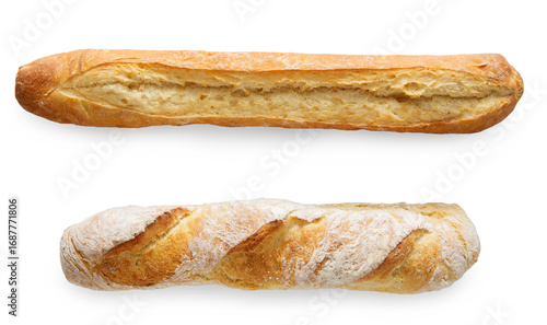 Two french crusty baguettes isolated at white background. Flat lay, top view