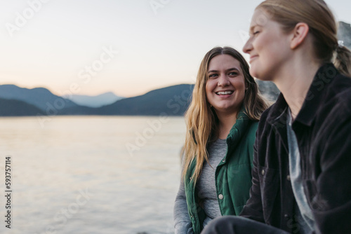 Two friends laughing together outside in nature.
