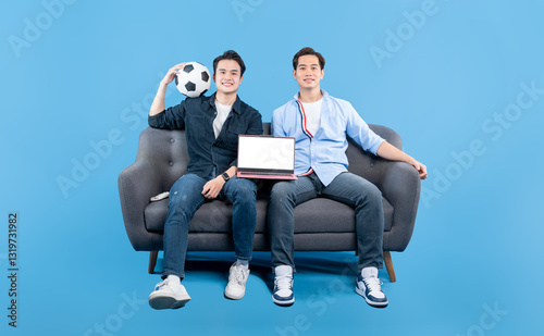 Two friends on couch with laptop and soccer ball. Cheerful males watching match online. Cozy indoor setting, bright background.