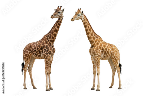 Two giraffes standing facing each other isolated on white background