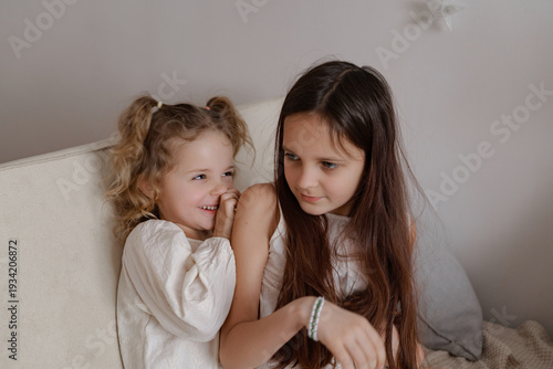 Two girls are sitting on a sofa in a well-lit room during the afternoon. One girl is whispering to the other, who looks amused