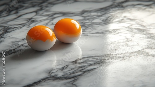Two glossy, orange and white dessert spheres on a marbled surface.