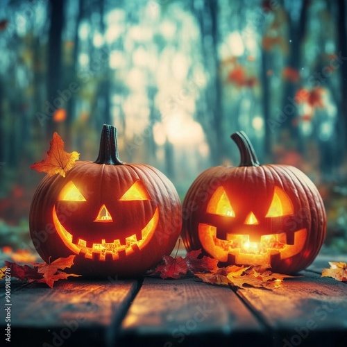 Two glowing jack-o-lanterns on a wooden surface with autumn leaves in a forest