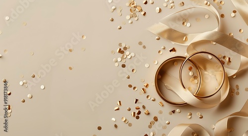 Two gold wedding rings with golden ribbons and confetti on a beige background