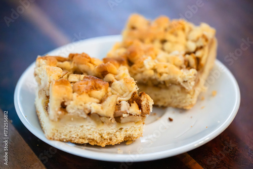 Two golden apple crumble bars rest on a white plate, showcasing layers of spiced apple filling and buttery crumb topping against a dark wooden background.