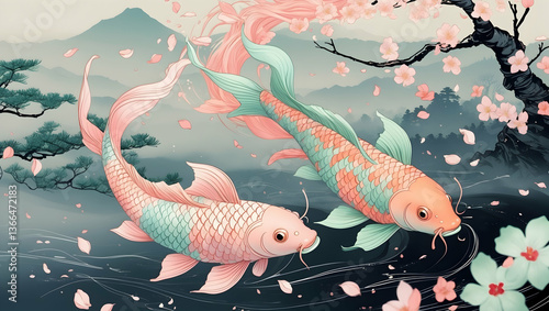 Two graceful koi fish swimming among cherry blossoms, serene oriental artwork.