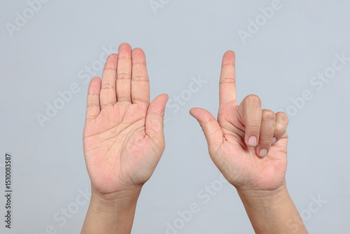 Two hands forming number seven with open palm and raised fingers in sign language on gray background symbolizing counting gesture and nonverbal communication