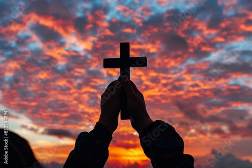Two hands holding a cross with a sunrise in the background, copy space for text Generative AI