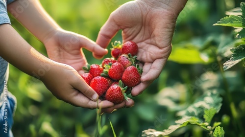 Two hands holding freshly picked strawberries in a lush green environment.