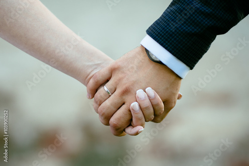 Two hands of loving bride and groom on wedding day