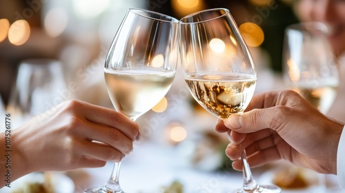 Two hands with wine glasses clinking in celebration against warmly lit bokeh, representing an intimate and joyful occasion.