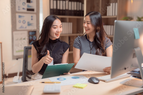 Two happy Asian businesswomen are analyzing financial charts and company sales documents, using a computer and showing thumbs up for good news