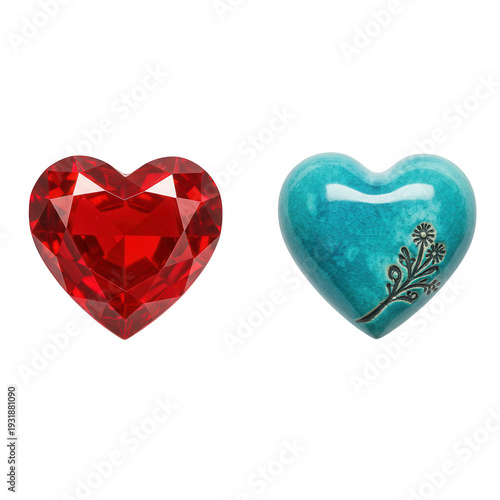 Two hearts red gem and blue ceramic isolated on transparent background