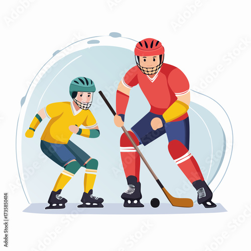 Two hockey players in action, one in red and one in yellow, playing on ice.