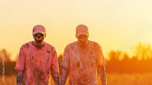 Two individuals in artistic skull makeup walking together at sunset, creating a striking and eerie atmosphere.