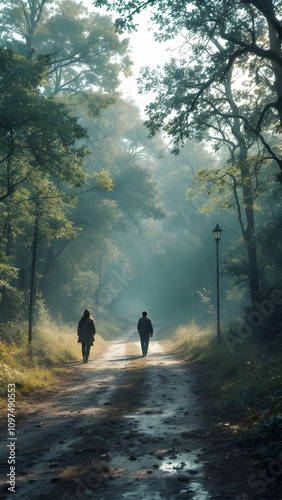 Two individuals walk away down a misty forest path. Sunlight filters through the trees, illuminating a dirt road with puddles. A lone lamppost stands beside the path.