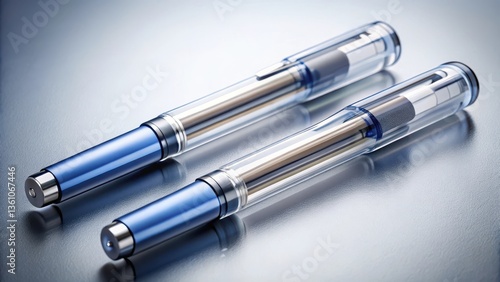 Two insulin pens with precise liquid flow and sleek designs on a sterile surface for diabetes management , health monitoring, pharmaceuticals