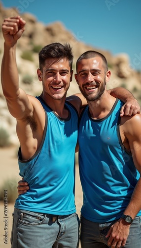 Two joyful men celebrating together in a sunny outdoor setting