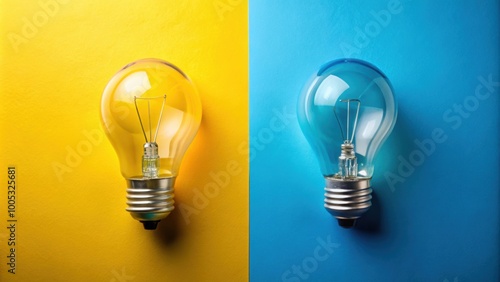 Two light bulbs against split blue and yellow background, innovation, creativity, contrast, idea, concept, electric