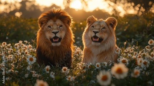 Two lions resting in a field of flowers at sunset, capturing a serene moment in nature
