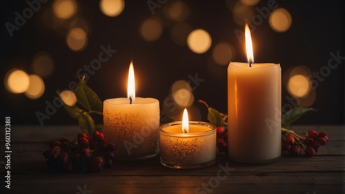 Two lit candles on wooden surface in dim lighting symbolize warmth and tranquility.