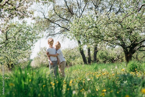 two little cute brothers cheerful walk in the apple orchard on a sunny spring day. High quality photo