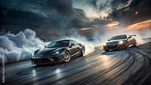 Two Luxury Cars Drifting Creating Smoke Trails on a Dark Track