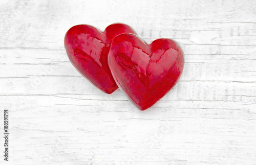 Two luxury red hearts on white wooden background. Happy Valentines day.