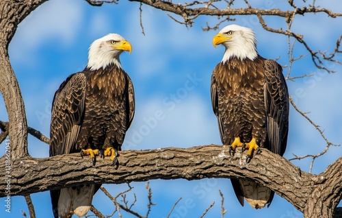 Two Majestic Bald Eagles Perched on Tree Branch Against Blue Sky
