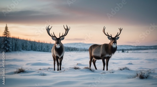 Two majestic reindeer with impressive antlers standing alert on snowy landscape at sunset