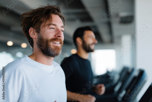 Two male caucasian young adults running on treadmills at gym smiling and focused during cardio