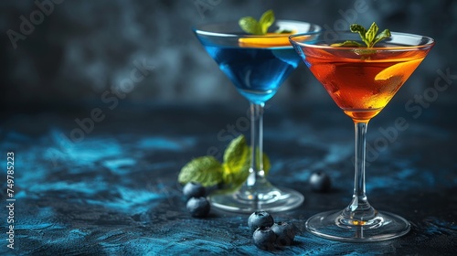 Two Martini Glasses with Blueberries and Mint Leaves, Fancy Cocktails Served in Stemware with Fresh Ingredients, A Pair of Colorful Martini Glasses on a Table,