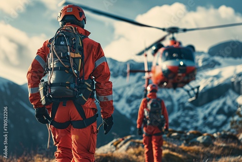 Two medical responders equipped with safety gear and climbing apparatus rushing to aid a helicopter emergency medical team, embodying the themes of salvation and optimism.