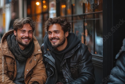 Two men are sitting outside, smiling and laughing