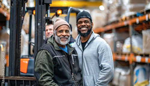 Two men are standing together inside a warehouse, engaged in a quiet conversation