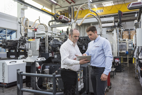 Two men with tablet talking in factory shop floor
